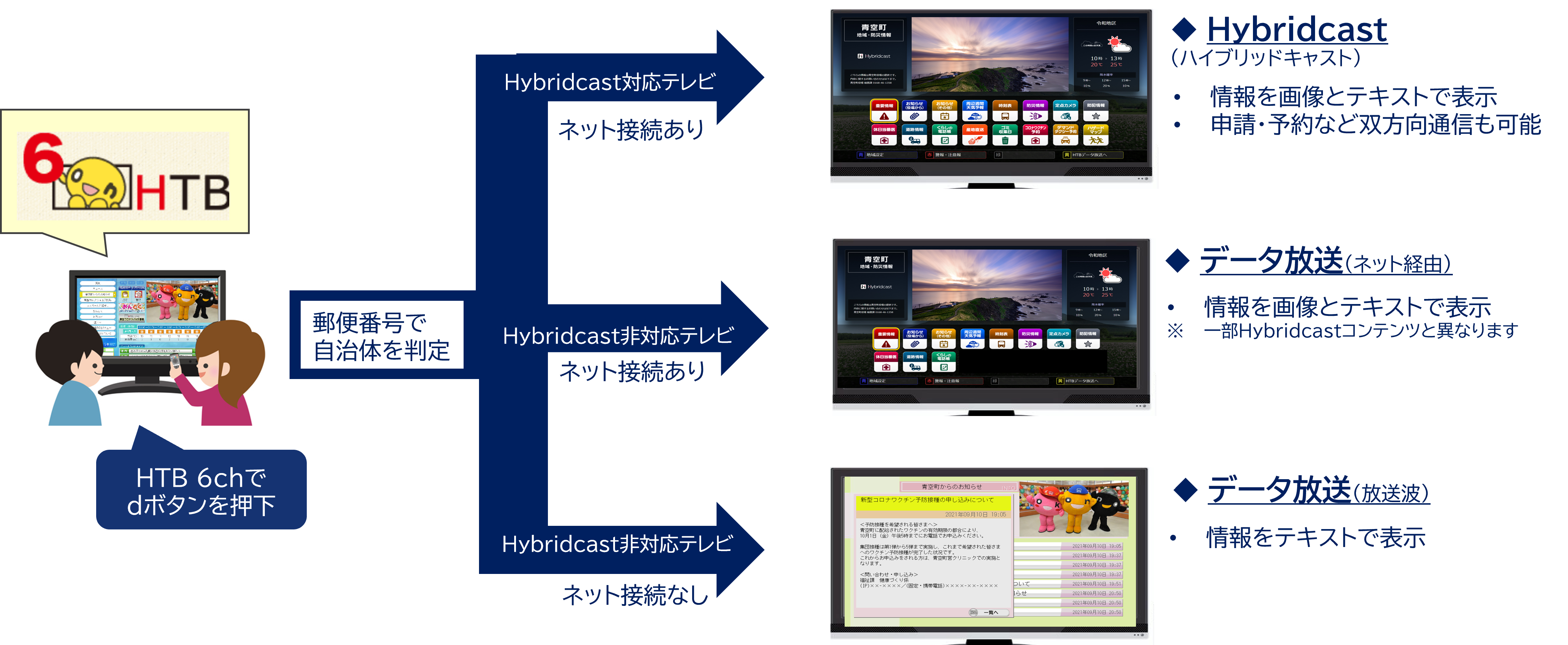 Hybridcastを活用することにより、データ放送だけでは実現できないきめ細やかな地域・防災情報配信が可能になります。Hybridcastは双方向通信が可能なため、テレビで自治体・地域・住民が相互に繋がる環境を実現できます。また、テレビがインターネットに接続されていない場合は、データ放送で情報配信を行うため、テレビをお持ちのご家庭すべてに情報を届けることができます。
